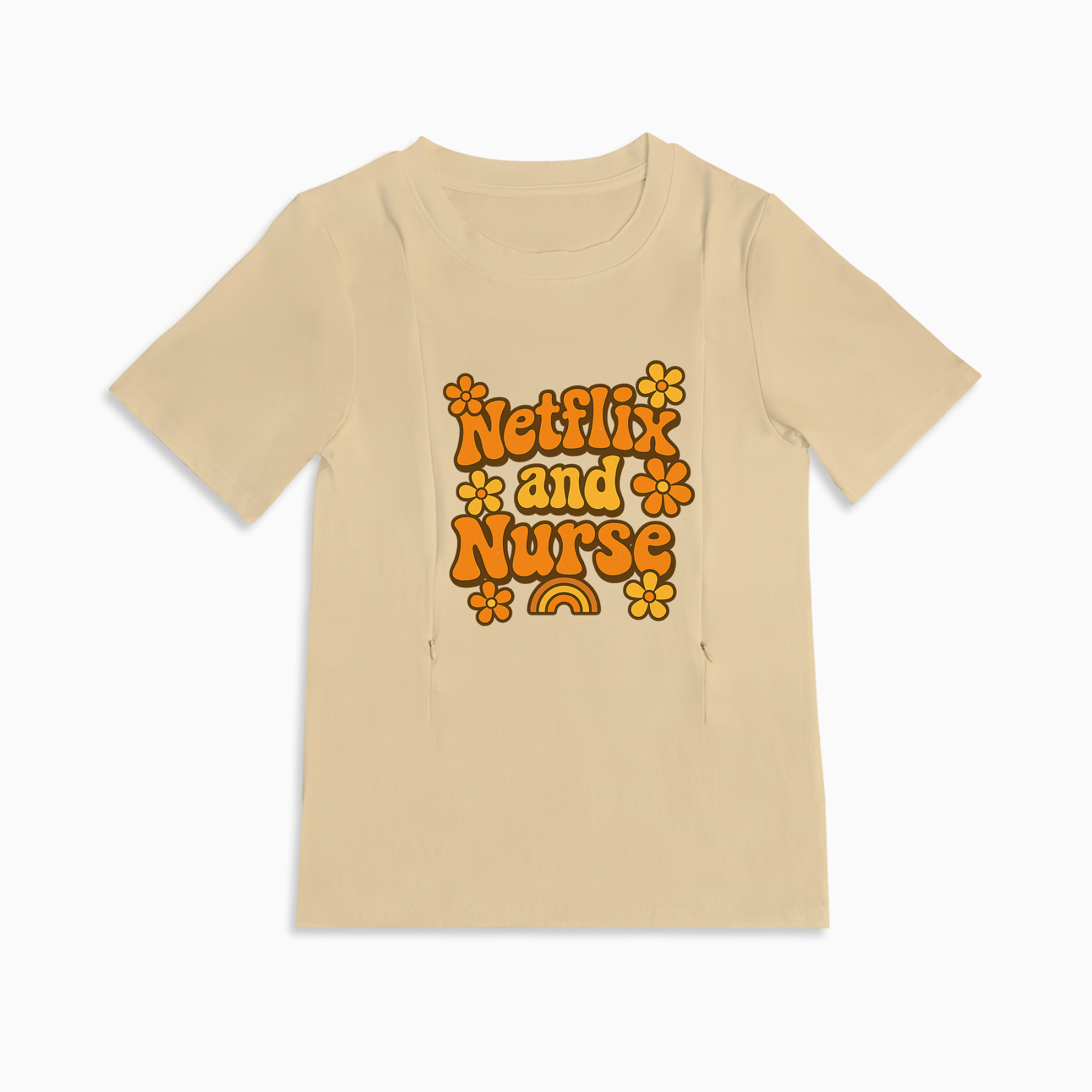 For the mama who deserves to relax, our “Netflix and Nurse” T-shirt is your new uniform for cozy cuddles and marathon feeding sessions. We know that being a new mom is a full-time job, and you deserve clothing that’s as practical as it is fun. This tee combines a playful, relatable slogan with the brilliant convenience of hidden side zippers, making it a staple for your fourth-trimester wardrobe.